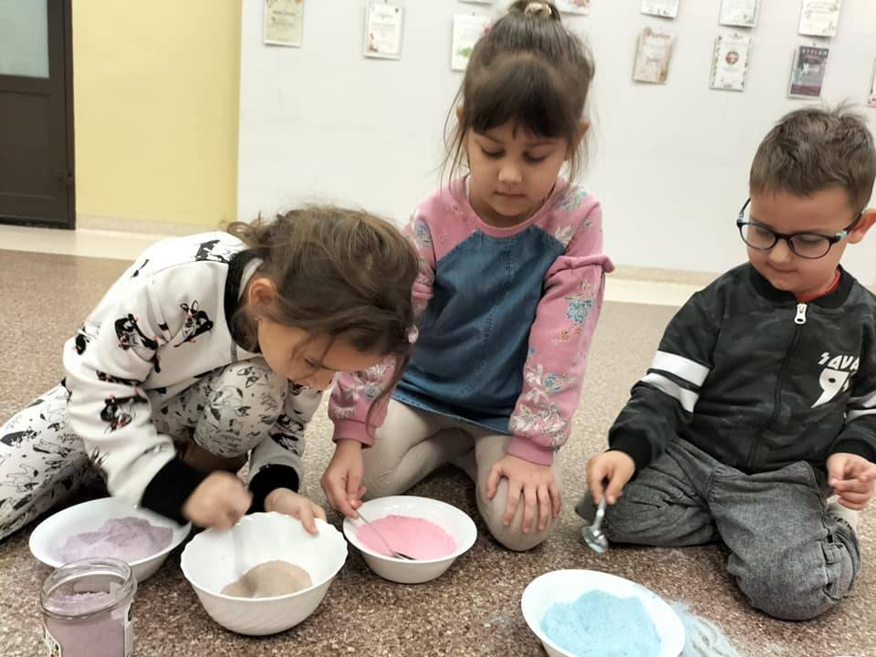 Mieszanie kolorów i obserwowanie zmieniającej się barwy soli, dało dzieciom mnóstwo radości. Sprawdziliśmy też, co stanie się po wymieszaniu wszystkich kolorów :)
