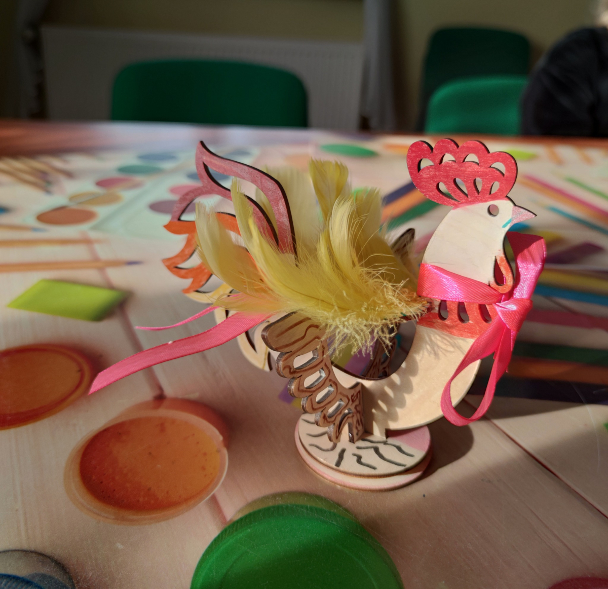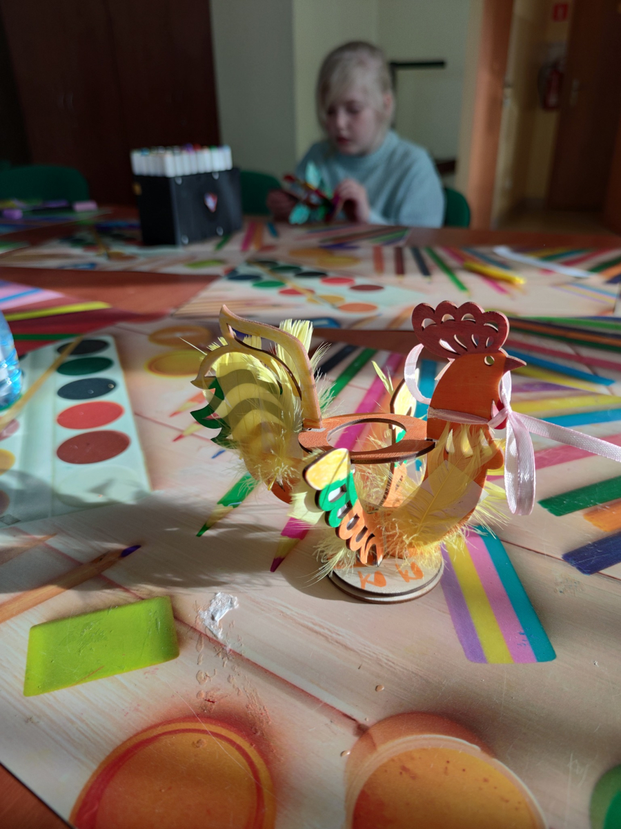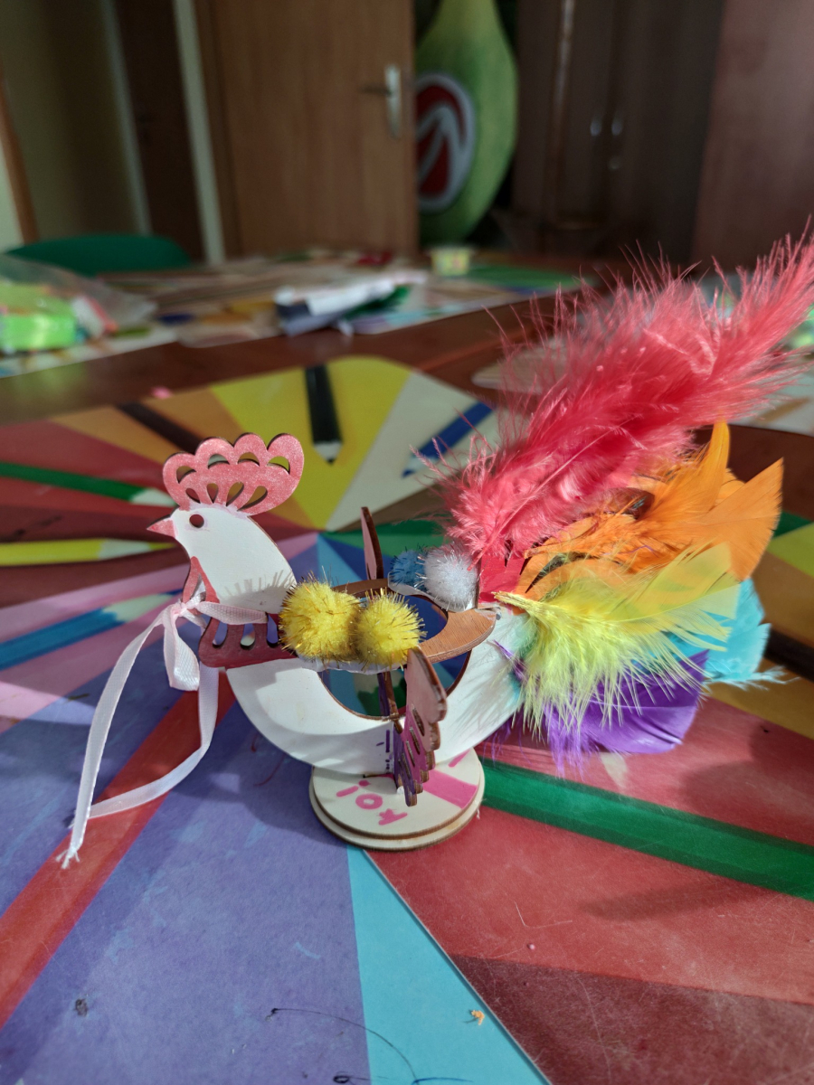 Dnia 13.04.2026 na naszych zajęciach kreatywnych było naprawdę kolorowo i twórczo! Dzieci z ogromnym zaangażowaniem tworzyły wyjątkowe drewniane koguciki - malowały je w najróżniejsze barwy, a następnie ozdabiały piórkami, nadając im niepowtarzalny charakter. Każda praca była inna i pełna dziecięcej wyobraźni. To była świetna okazja do rozwijania kreatywności, zdolności manualnych i dobrej zabawy w miłej atmosferze. Brawo dla wszystkich małych artystów!